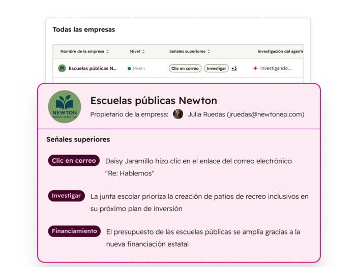 Obtén respuestas instantáneas sobre tus prospectos y leads con un agente de datos con IA que investiga empresas, analiza las señales de compra y crea comunicaciones personalizadas utilizando tu CRM y los datos de la web